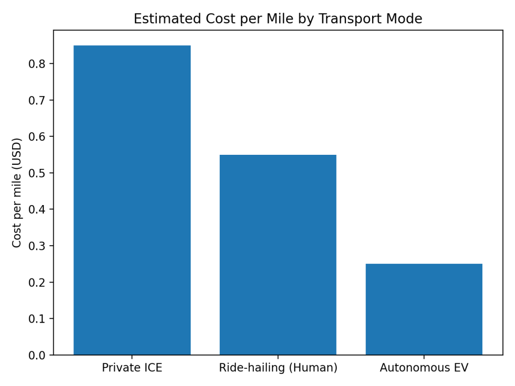 According to analysis from ARK Invest, private ICE vehicles cost roughly $0.70 to $1.00 per mile. Human-driven ride-hailing lowers ownership inefficiencies but remains constrained by labour costs. Fully autonomous electric vehicles could operate at $0.20 to $0.30 per mile at scale.