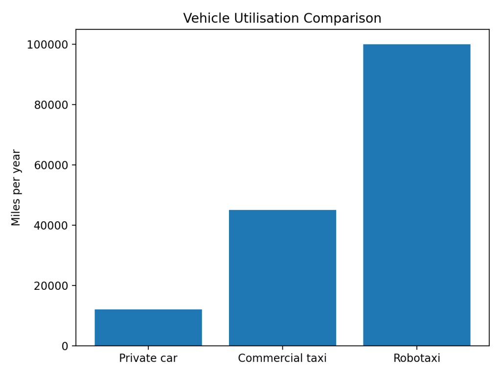 Private cars average around 12,000 miles per year. Robotaxis could exceed 100,000 miles annually, spreading fixed costs, accelerating learning, and improving service availability. This utilisation flywheel underpins both the economics and the pace of improvement.