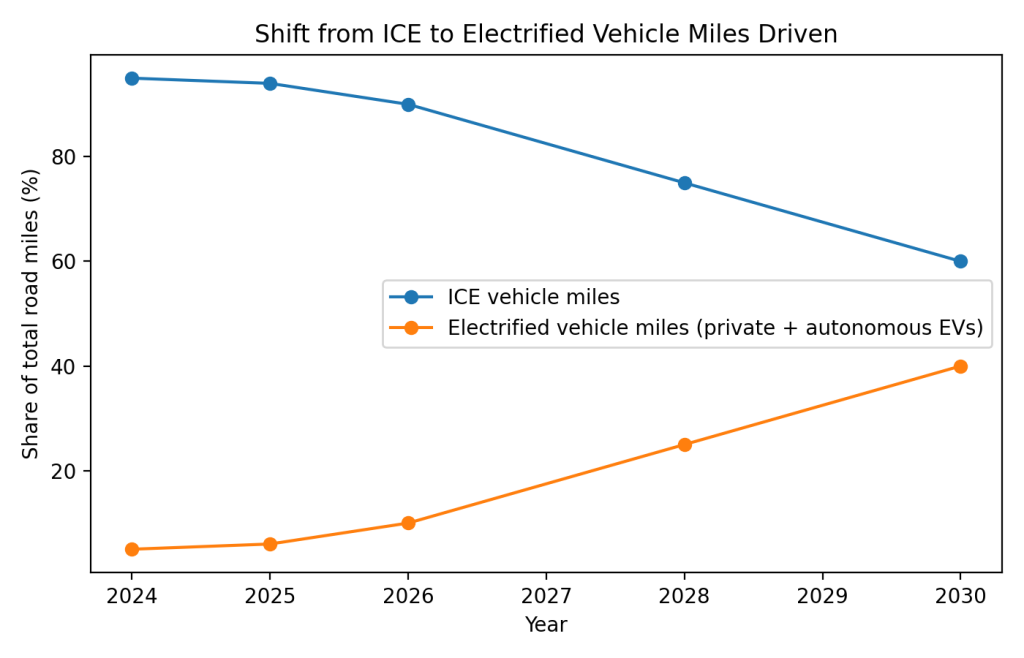 Autonomous fleets drive five to ten times more miles per vehicle than private cars. Because autonomy is tightly coupled to electric vehicles, each deployment displaces disproportionately more ICE miles.